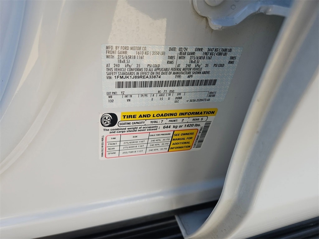 Check out all these great options Avis Certified Certified, Bumpers: body-color, Heated door mirrors, Panic alarm, Power door mirrors, Security system, Speed control, Spoiler, 18" Machined-Face Aluminum Wheels, 3.31 Axle Ratio, 3rd row seats: split-bench, 4-Wheel Disc Brakes, 6 Speakers, ABS brakes, Air Conditioning, Alloy wheels, AM/FM radio: SiriusXM with 360L, Auto High-beam Headlights, Auto-dimming Rear-View mirror, Automatic temperature control, Brake assist, Cloth Front Captain's Chairs, Compass, Delay-off headlights, Driver door bin, Driver vanity mirror, Dual front impact airbags, Dual front side impact airbags, Electronic Stability Control, Emergency communication system: SYNC 4 911 Assist, Exterior Parking Camera Rear, Four wheel independent suspension, Front anti-roll bar, Front Bucket Seats, Front Center Armrest, Front dual zone A/C, Front reading lights, Fully automatic headlights, Garage door transmitter, Illuminated entry, Leather steering wheel, Low tire pressure warning, Navigation system: Connected Navigation, Occupant sensing airbag, Outside temperature display, Overhead airbag, Overhead console, Passenger door bin, Passenger vanity mirror, Power driver seat, Power steering, Power windows, Radio data system, Radio: AM/FM Stereo w/MP3 Capable, Rear air conditioning, Rear anti-roll bar, Rear reading lights, Rear window defroster, Rear window wiper, Reclining 3rd row seat, Remote keyless entry, SiriusXM w/360L, Speed-sensing steering, Speed-Sensitive Wipers, Split folding rear seat, Steering wheel mounted audio controls, SYNC 4 w/Enhanced Voice Recognition, Tachometer, Telescoping steering wheel, Tilt steering wheel, Traction control, Trip computer, Variably intermittent wipers, and Voltmeter.