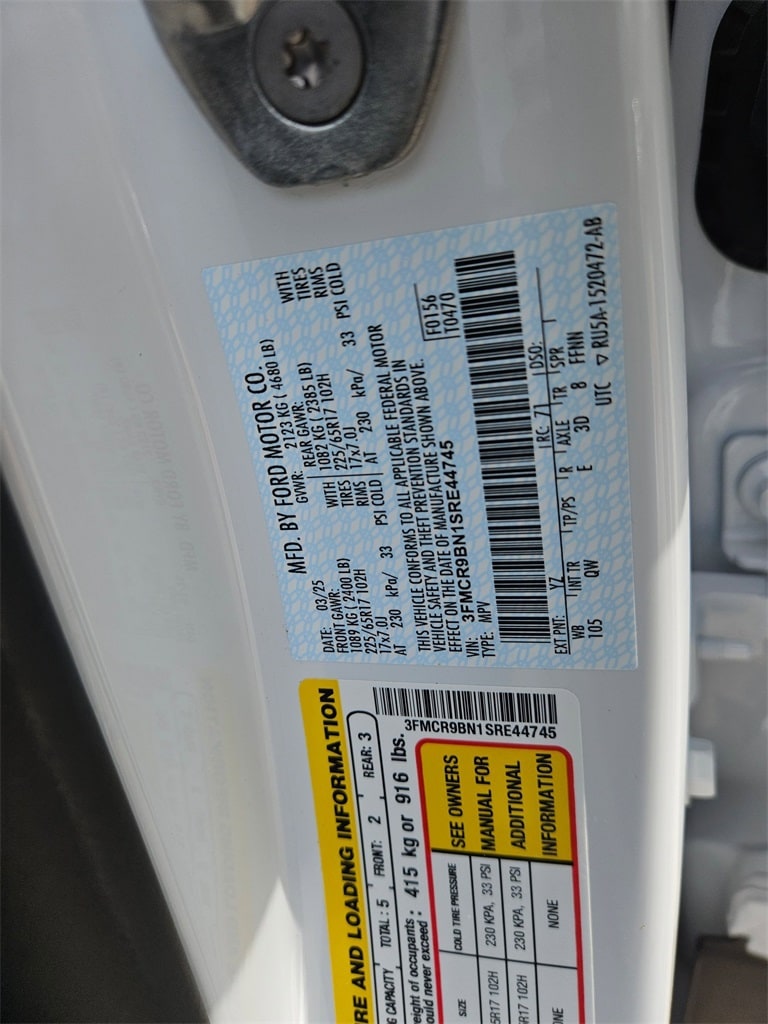 Check out all these great options Avis Certified Certified, Rear Parking Sensors, Split folding rear seat, Wheels: 17" Carbonized Gray-Painted Aluminum, 4-Wheel Disc Brakes, 6 Speakers, ABS brakes, Air Conditioning, Alloy wheels, AM/FM radio: SiriusXM, AM/FM Stereo, Auto High-beam Headlights, Automatic temperature control, Brake assist, Cloth w/Easy-to-Clean Front Bucket Seats, Compass, Delay-off headlights, Driver door bin, Driver vanity mirror, Dual front impact airbags, Dual front side impact airbags, Electronic Stability Control, Emergency communication system: SYNC 4 911 Assist, Four wheel independent suspension, Front anti-roll bar, Front Bucket Seats, Front Center Armrest, Front reading lights, Fully automatic headlights, Heated door mirrors, Illuminated entry, Knee airbag, Low tire pressure warning, Occupant sensing airbag, Outside temperature display, Overhead airbag, Overhead console, Panic alarm, Passenger door bin, Passenger vanity mirror, Power door mirrors, Power steering, Power windows, Radio data system, Rear anti-roll bar, Rear reading lights, Rear seat center armrest, Rear window defroster, Rear window wiper, Remote keyless entry, Security system, SiriusXM, Speed control, Speed-sensing steering, Speed-Sensitive Wipers, Steering wheel mounted audio controls, SYNC 4 w/Enhanced Voice Recognition, Tachometer, Telescoping steering wheel, Tilt steering wheel, Traction control, Trip computer, and Variably intermittent wipers.