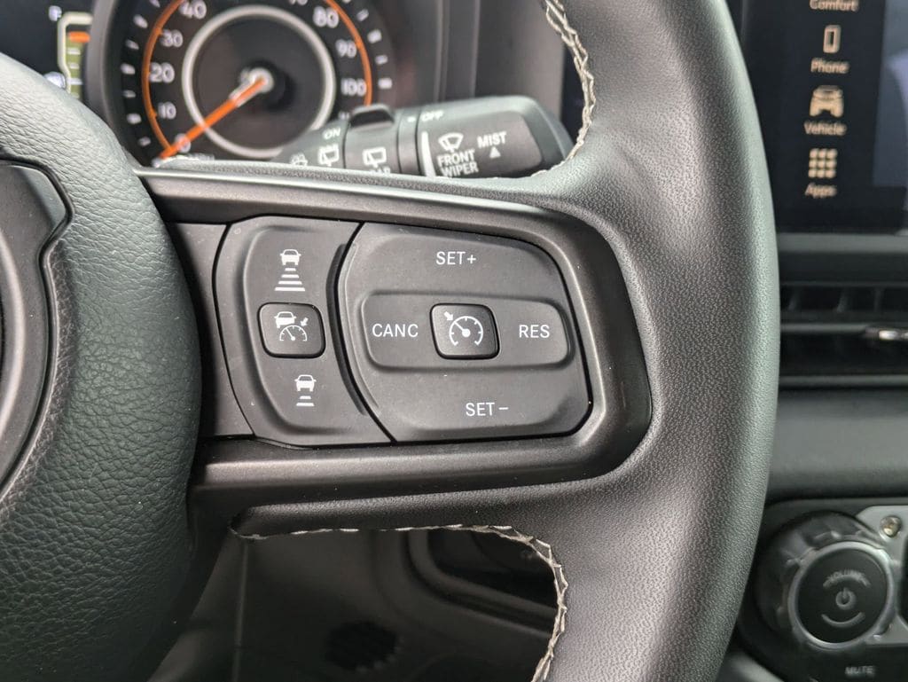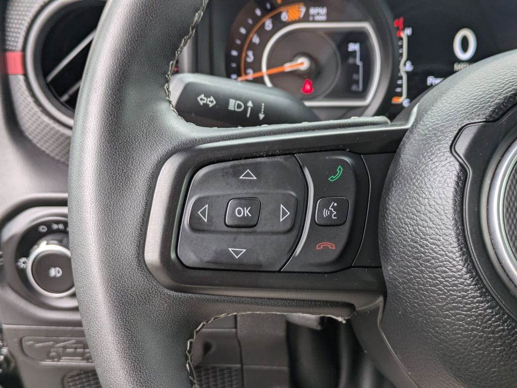 Check out all these great options Convenience Group (Heated Front Seats, Heated Steering Wheel, and Universal Garage Door Opener), Avis Certified Certified, Apple CarPlay/Android Auto, Class II Receiver Hitch, Cloth Low-Back Bucket Seats, ParkView Rear Back-Up Camera, Power windows, Remote keyless entry, Wheels: 17" x 7.5" Machined/Painted Black, 4-Wheel Disc Brakes, 4.10 Rear Axle Ratio, 4G LTE Wi-Fi Hot Spot, 8 Speakers, 97 MPH Vehicle Max Speed Calibration, ABS brakes, Air Conditioning, Alloy wheels, AM/FM radio: SiriusXM, Apple CarPlay, Automatic temperature control, Aux Battery, Auxiliary Switches, Brake assist, Compass, Connectivity - US/Canada, Delay-off headlights, Driver door bin, Driver vanity mirror, Dual front impact airbags, Dual front side impact airbags, Electronic Stability Control, Emergency communication system: Jeep Connect, Front anti-roll bar, Front Bucket Seats, Front Center Armrest w/Storage, Front dual zone A/C, Front fog lights, Front reading lights, Fully automatic headlights, Google Android Auto, Heated door mirrors, Illuminated entry, Integrated roll-over protection, Low tire pressure warning, Non-Lock Fuel Cap w/o Discriminator, Occupant sensing airbag, Outside temperature display, Overhead airbag, Panic alarm, Passenger door bin, Passenger vanity mirror, Performance Suspension, Power door mirrors, Power steering, Radio data system, Radio: Uconnect 5 w/12.3" Display, Rear anti-roll bar, Rear reading lights, Security system, Speed control, Split folding rear seat, Steering wheel mounted audio controls, Stop-Start Dual Battery System, Tachometer, Telescoping steering wheel, Tilt steering wheel, Traction control, Trip computer, Variably intermittent wipers, and Voltmeter.