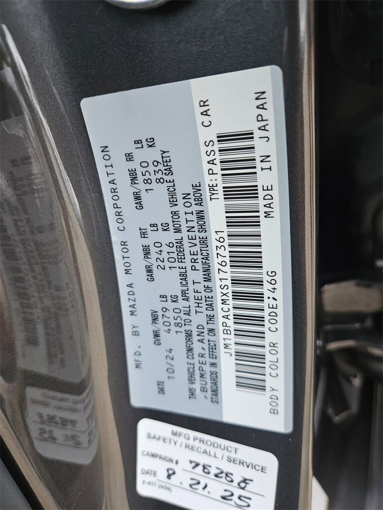 Check out all these great options Avis Certified Certified, 4-Wheel Disc Brakes, 6 Speakers, ABS brakes, Air Conditioning, Alloy wheels, AM/FM radio, AppLink/Apple CarPlay and Android Auto, Auto High-beam Headlights, Automatic temperature control, Brake assist, Bumpers: body-color, Compass, Delay-off headlights, Driver door bin, Driver vanity mirror, Dual front impact airbags, Dual front side impact airbags, Electronic Stability Control, Emergency communication system: Mazda Connected Services (1-year complimentary trial included), Exterior Parking Camera Rear, Front anti-roll bar, Front Bucket Seats, Front Center Armrest, Front dual zone A/C, Front reading lights, Front wheel independent suspension, Fully automatic headlights, Heated door mirrors, Heated front seats, Heated Front Sport Bucket Seats, Illuminated entry, Knee airbag, Leather Shift Knob, Leather steering wheel, Leatherette Seat Trim, Low tire pressure warning, Machine Gray Metallic Paint Charge, MAZDA CONNECT Infotainment System, Memory seat, Occupant sensing airbag, Outside temperature display, Overhead airbag, Overhead console, Panic alarm, Passenger door bin, Passenger vanity mirror, Power door mirrors, Power driver seat, Power moonroof, Power steering, Power windows, Radio data system, Radio: AM/FM Audio System, Rain sensing wipers, Rear seat center armrest, Rear side impact airbag, Rear window defroster, Remote keyless entry, Speed control, Speed-sensing steering, Split folding rear seat, Steering wheel mounted audio controls, Tachometer, Telescoping steering wheel, Tilt steering wheel, Traction control, Trip computer, Turn signal indicator mirrors, Variably intermittent wipers, and Wheels: 18" x 7J Aluminum Alloy.