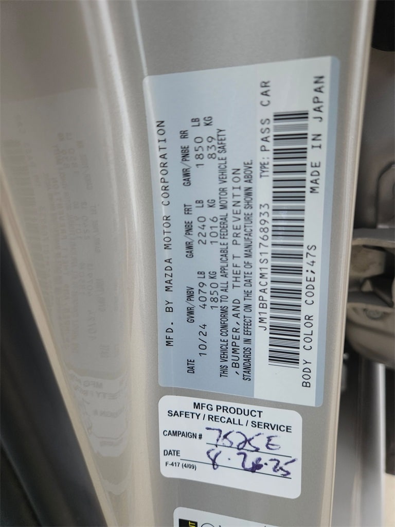 Check out all these great options Avis Certified Certified, 4-Wheel Disc Brakes, 6 Speakers, ABS brakes, Air Conditioning, Alloy wheels, AM/FM radio, AppLink/Apple CarPlay and Android Auto, Auto High-beam Headlights, Automatic temperature control, Brake assist, Bumpers: body-color, Compass, Delay-off headlights, Driver door bin, Driver vanity mirror, Dual front impact airbags, Dual front side impact airbags, Electronic Stability Control, Emergency communication system: Mazda Connected Services (1-year complimentary trial included), Exterior Parking Camera Rear, Front anti-roll bar, Front Bucket Seats, Front Center Armrest, Front dual zone A/C, Front reading lights, Front wheel independent suspension, Fully automatic headlights, Heated door mirrors, Heated front seats, Heated Front Sport Bucket Seats, Illuminated entry, Knee airbag, Leather Shift Knob, Leather steering wheel, Leatherette Seat Trim, Low tire pressure warning, MAZDA CONNECT Infotainment System, Memory seat, Occupant sensing airbag, Outside temperature display, Overhead airbag, Overhead console, Panic alarm, Passenger door bin, Passenger vanity mirror, Power door mirrors, Power driver seat, Power moonroof, Power steering, Power windows, Radio data system, Radio: AM/FM Audio System, Rain sensing wipers, Rear seat center armrest, Rear side impact airbag, Rear window defroster, Remote keyless entry, Speed control, Speed-sensing steering, Split folding rear seat, Steering wheel mounted audio controls, Tachometer, Telescoping steering wheel, Tilt steering wheel, Traction control, Trip computer, Turn signal indicator mirrors, Variably intermittent wipers, and Wheels: 18" x 7J Aluminum Alloy.