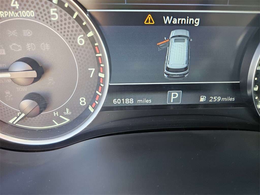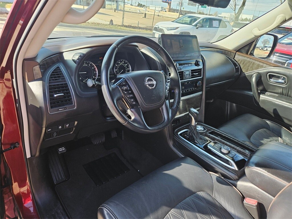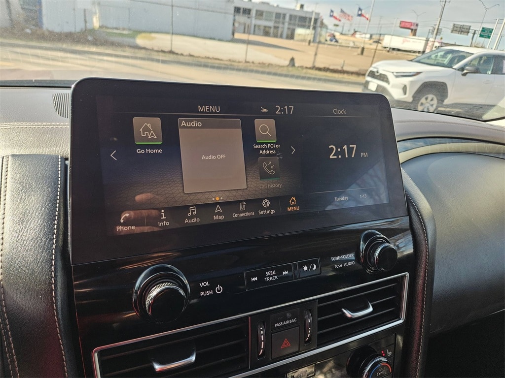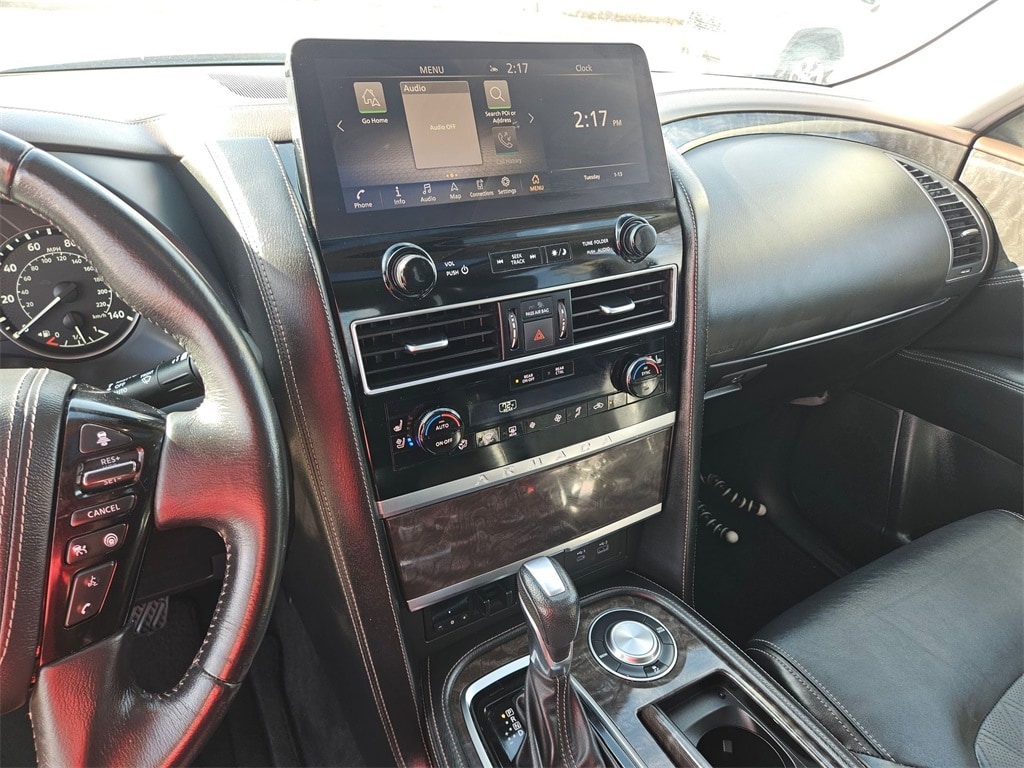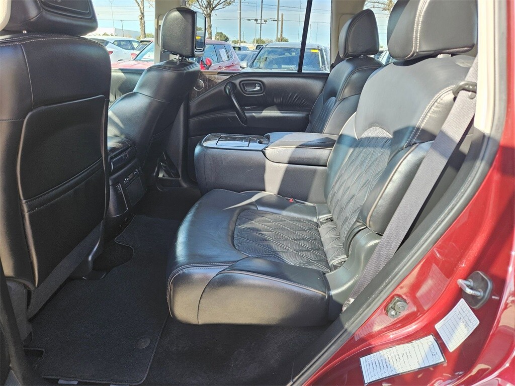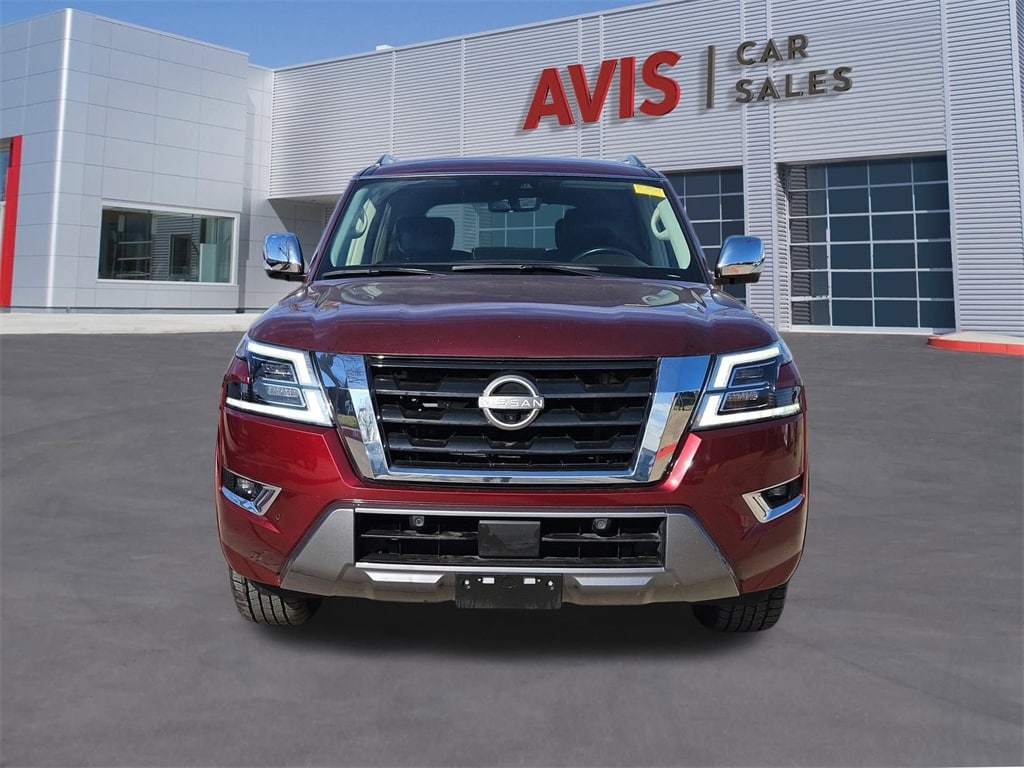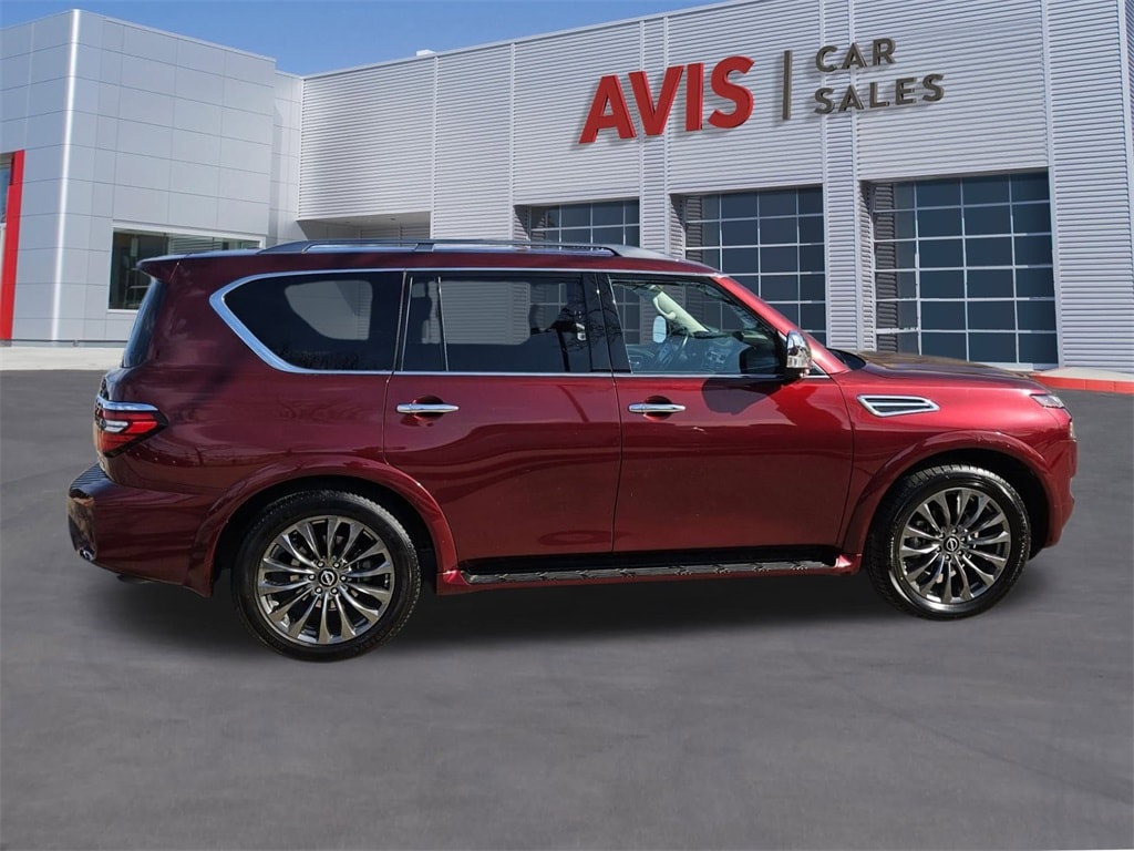 Check out all these great options Avis Certified Certified, Auto High-beam Headlights, Auto-dimming door mirrors, Brake assist, Bumpers: body-color, Delay-off headlights, Electronic Stability Control, Exterior Parking Camera Rear, Front fog lights, Fully automatic headlights, Heated door mirrors, Panic alarm, Power door mirrors, Power Liftgate, Security system, Speed control, 13 Speakers, 2.94 Axle Ratio, 3rd row seats: split-bench, 4-Wheel Disc Brakes, A/V remote, ABS brakes, Air Conditioning, Alloy wheels, AM/FM radio: SiriusXM, Anti-whiplash front head restraints, Auto tilt-away steering wheel, Auto-dimming Rear-View mirror, Auto-leveling suspension, Automatic temperature control, Bose 13-Speaker Premium Audio System, Climate-Controlled Front Bucket Seats, Driver door bin, Driver vanity mirror, Dual front impact airbags, Dual front side impact airbags, Emergency communication system: NissanConnect Services, Four wheel independent suspension, Front anti-roll bar, Front Bucket Seats, Front Center Armrest, Front dual zone A/C, Front reading lights, Garage door transmitter: HomeLink, Headphones, Heated front seats, Heated rear seats, Heated steering wheel, Illuminated entry, Knee airbag, Leather Shift Knob, Low tire pressure warning, Memory seat, Navigation System, NissanConnect featuring Apple CarPlay and Android Auto, Occupant sensing airbag, Outside temperature display, Overhead airbag, Overhead console, Passenger door bin, Passenger vanity mirror, Power driver seat, Power moonroof, Power passenger seat, Power steering, Power windows, Premium audio system: Bose, Quilted Leather Seat Trim, Radio: NissanConnect w/SiriusXM, Rain sensing wipers, Rear air conditioning, Rear anti-roll bar, Rear reading lights, Rear seat center armrest, Rear window defroster, Rear window wiper, Reclining 3rd row seat, Remote keyless entry, Speed-sensing steering, Speed-Sensitive Wipers, Split folding rear seat, Spoiler, Steering wheel memory, Steering wheel mounted audio controls, Tachometer, Telescoping steering wheel, Tilt steering wheel, Traction control, Trip computer, Turn signal indicator mirrors, Variably intermittent wipers, Ventilated front seats, Voltmeter, and Wheels: 22" x 8J Machine-Faced w/Tinted Clear Coat.