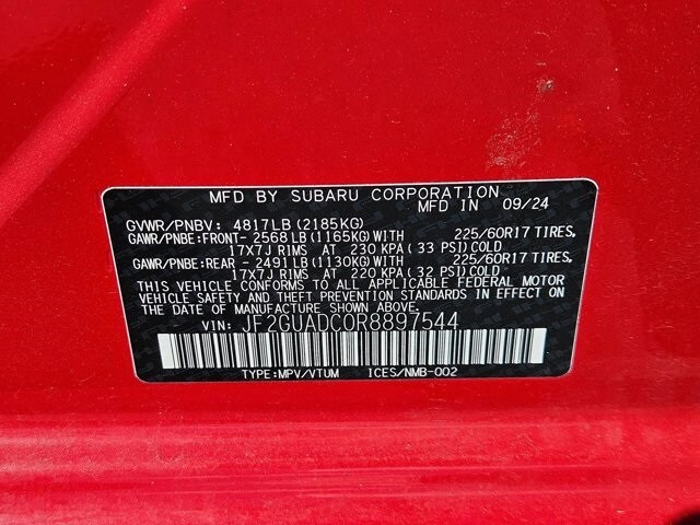 Check out all these great options Avis Car Sales Certified, 3.90 Axle Ratio, 4-Wheel Disc Brakes, 6 Speakers, ABS brakes, Air Conditioning, Alloy wheels, AM/FM radio: SiriusXM, Anti-whiplash front head restraints, Auto High-beam Headlights, Automatic temperature control, Brake assist, Bumpers: body-color, Driver door bin, Driver vanity mirror, Dual front impact airbags, Dual front side impact airbags, Electronic Stability Control, Emergency communication system: STARLINK Safety and Security (Subscription Required), Exterior Parking Camera Rear, Four wheel independent suspension, Front anti-roll bar, Front Bucket Seats, Front Center Armrest, Front dual zone A/C, Front fog lights, Front reading lights, Fully automatic headlights, Illuminated entry, Knee airbag, Low tire pressure warning, Occupant sensing airbag, Outside temperature display, Overhead airbag, Overhead console, Panic alarm, Passenger door bin, Passenger vanity mirror, Power door mirrors, Power steering, Power windows, Premium Cloth Upholstery, Radio data system, Radio: Subaru STARLINK 11.6" Multimedia Plus Sys, Rear anti-roll bar, Rear seat center armrest, Rear window defroster, Rear window wiper, Remote keyless entry, Security system, Speed control, Speed-sensing steering, Split folding rear seat, Spoiler, STARLINK/Apple CarPlay/Android Auto, Steering wheel mounted audio controls, Tachometer, Telescoping steering wheel, Tilt steering wheel, Traction control, Trip computer, Turn signal indicator mirrors, Variably intermittent wipers, and Wheels: 17" x 7.0J Dark Gray Aluminum Alloy.