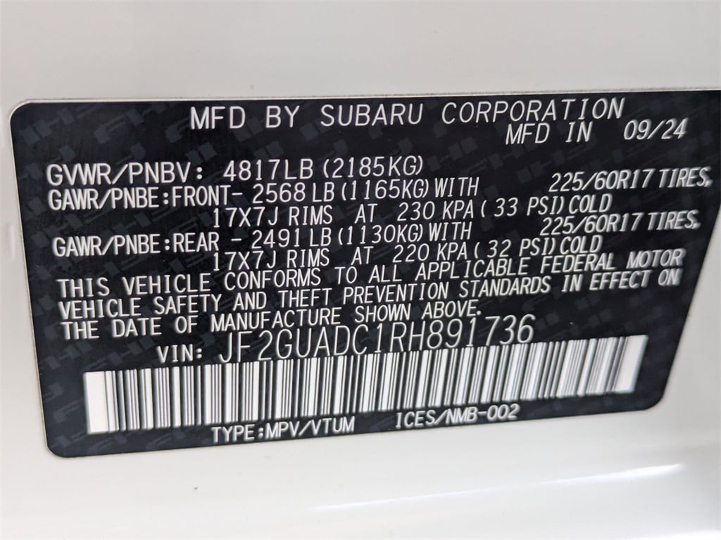 Check out all these great options All-Weather Package (Heated Exterior Mirrors, Heated Front Seats, and Heated Wipers), BSD/RCTA & Moonrf & All Weather Pkg & Pwr Dr. Seat (10-Way Power Driver's Seat, Blind Spot Detection w/Rear Cross-Traffic Alert, and Power Moonroof), Avis Certified Certified, Exterior Parking Camera Rear, Remote keyless entry, STARLINK/Apple CarPlay/Android Auto, Wheels: 17" x 7.0J Dark Gray Aluminum Alloy, 3.90 Axle Ratio, 4-Wheel Disc Brakes, 6 Speakers, ABS brakes, Air Conditioning, Alloy wheels, AM/FM radio: SiriusXM, Anti-whiplash front head restraints, Auto High-beam Headlights, Automatic temperature control, Brake assist, Bumpers: body-color, Driver door bin, Driver vanity mirror, Dual front impact airbags, Dual front side impact airbags, Electronic Stability Control, Emergency communication system: STARLINK Safety and Security (Subscription Required), Four wheel independent suspension, Front anti-roll bar, Front Bucket Seats, Front Center Armrest, Front dual zone A/C, Front fog lights, Front reading lights, Fully automatic headlights, Illuminated entry, Knee airbag, Low tire pressure warning, Occupant sensing airbag, Outside temperature display, Overhead airbag, Overhead console, Panic alarm, Passenger door bin, Passenger vanity mirror, Power door mirrors, Power steering, Power windows, Premium Cloth Upholstery, Radio data system, Radio: Subaru STARLINK 11.6" Multimedia Plus Sys, Rear anti-roll bar, Rear seat center armrest, Rear window defroster, Rear window wiper, Security system, Speed control, Speed-sensing steering, Split folding rear seat, Spoiler, Steering wheel mounted audio controls, Tachometer, Telescoping steering wheel, Tilt steering wheel, Traction control, Trip computer, Turn signal indicator mirrors, and Variably intermittent wipers.