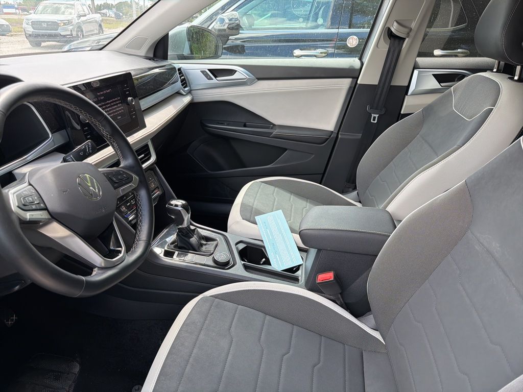 The spacious interior of the Taos offers ample room for passengers and cargo, with split-folding rear seats and a generous cargo area. Premium features like a heated steering wheel, power driver's seat, and advanced safety technologies like Blind Spot Monitoring and Rear Parking Camera make this Taos a truly well-equipped and versatile crossover.